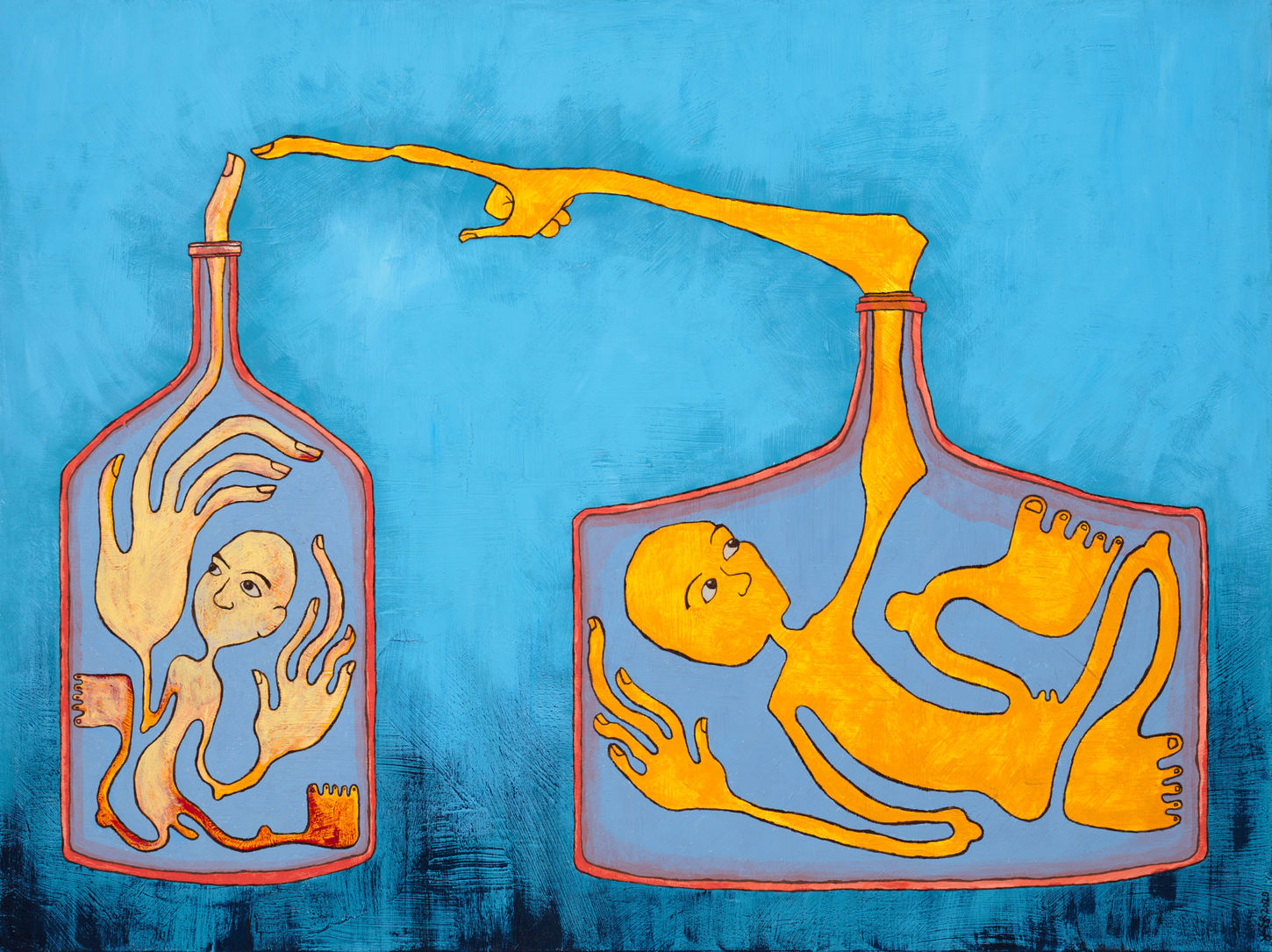 The painting depicts two figures trapped in bottles. The color of the glass is a specific coral pink which was commonly used in the manufacturing of Depression glass. The term “Depression glass” refers to a style of colorful, affordable glassware that was popular in the United States during the Great Depression in the 1920’s and 1930’s, roughly the same time period as the setting for Marquez’s novel. The figures reach for each other, but do not touch, demonstrating both their yearning for each other and their fear of infection. In his book, “Blue Dog,” George Rodrigue expressed this concept so poetically with the description “Always there's that space between what you feel and what you do, and in that gap, all human sadness lies.” In my painting, human sadness resides between those two fingertips.